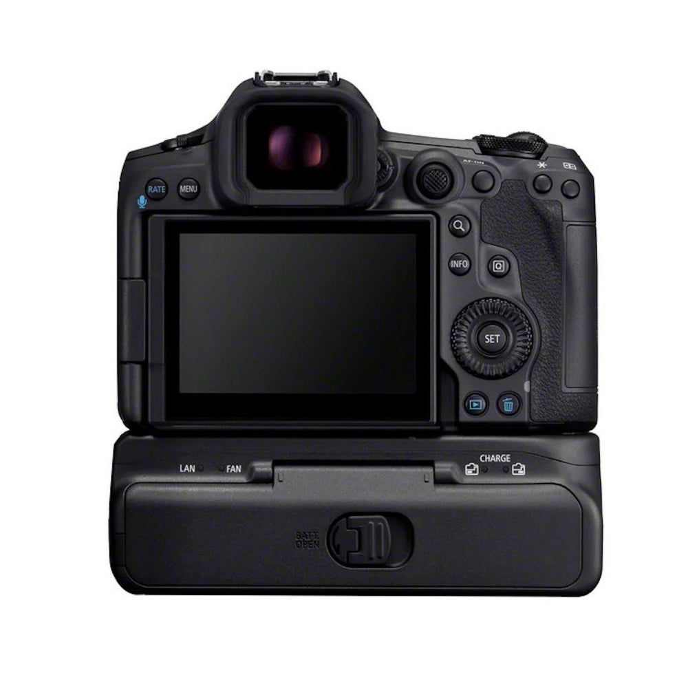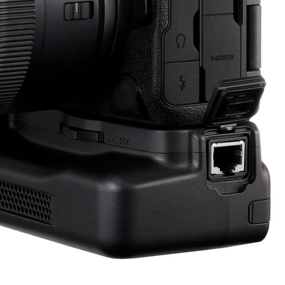 This ingenious cooling-fan battery grip pulls air into the EOS R5 Mark II, cooling its internal components and allowing much longer periods of continuous video capture—up to two hours, depending on the video format. It also features a 2.5 GBASE-T ethernet port for wired network connections.