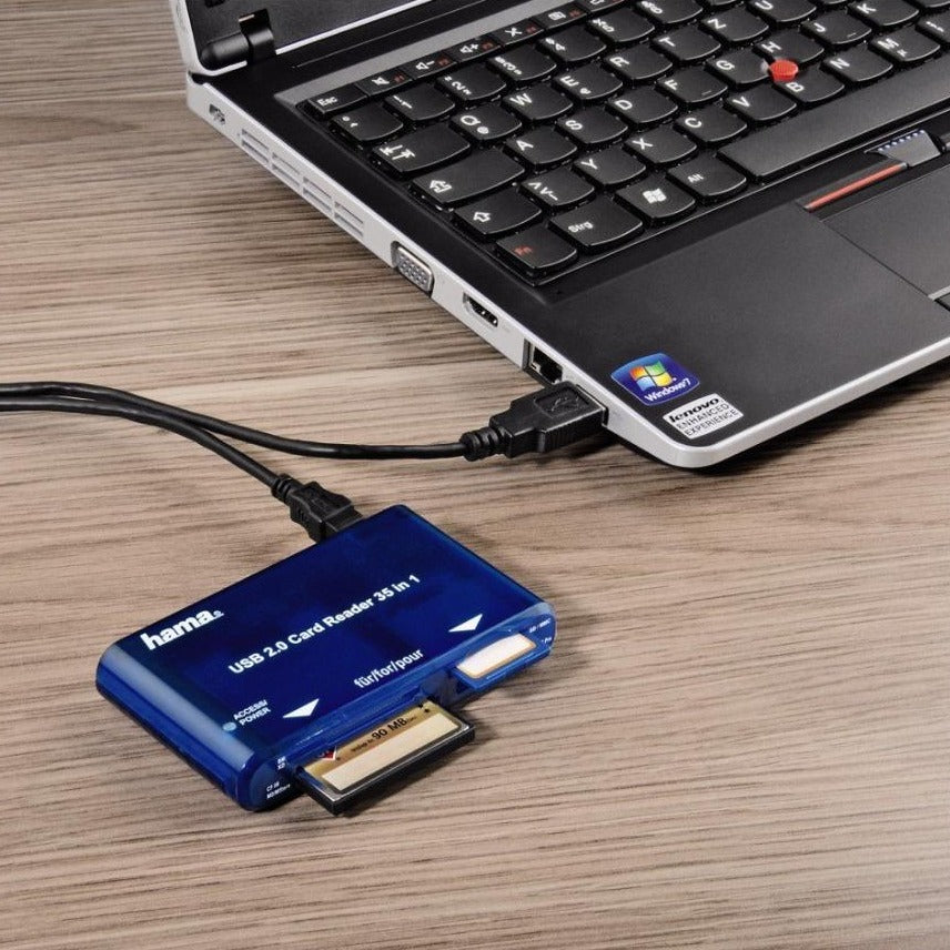 Uploading pictures from your mobile phone to your social networking site becomes easier with a card reader as you simply have to put the memory card in and away you go. No more need to have a cable to connect every piece of electronic equipment you own to the computer, everything can be done via the card reader. Take one more stress out of life with the Hama 35 in 1 card reader which gives you easy and quick access to your memory card data without taking up precious room on your computer desk.