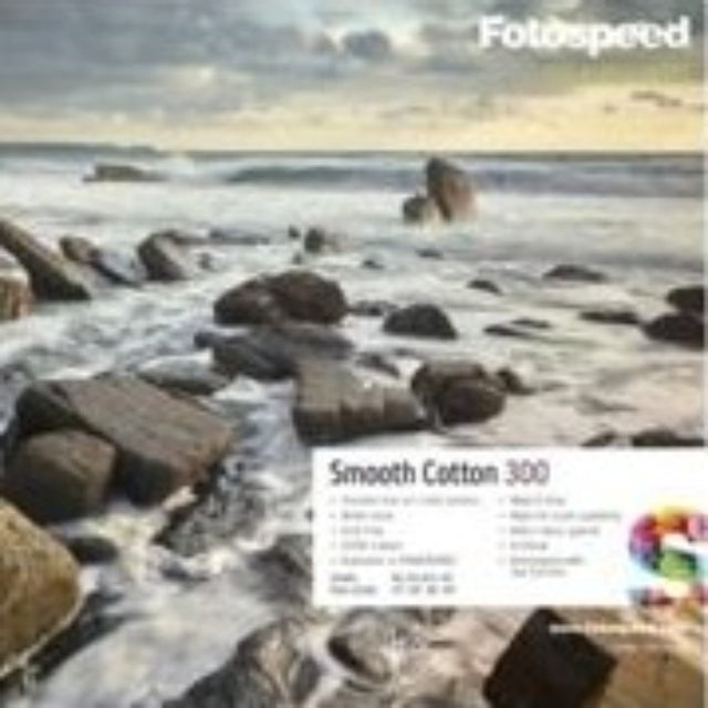 Smooth Cotton 300 is 100% cotton, pH neutral, fine art paper with an ultra-smooth surface. The paper’s white base and state of the art coating delivers the highest level of ink load of all the Fotospeed range. Smooth Cotton 300 is therefore ideal for high saturation images. When used in conjunction with pigment inks, the paper will ensure a print life of more than 85 years.
